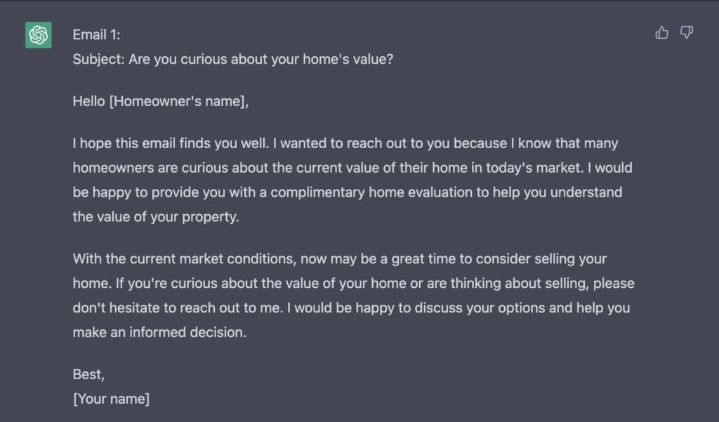 If your role as a real estate agent mostly consists of writing listing descriptions then yes, be worried. Obviously it does not, and you can’t minimize the value you provide clients. Ask any seasoned agent if they’re worried about ChatGPT and they’ll tell you no.